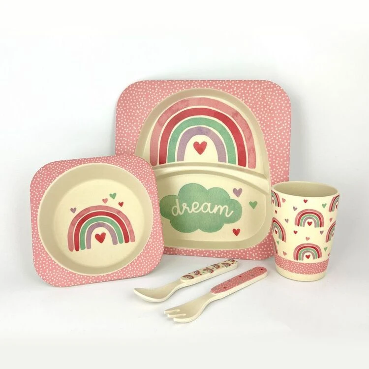 The Frankie & Me Bamboo Kids Set 5Pk Rainbow is a reusable, environmentally friendly alternative to single-use plastic tableware. The divided plates are designed with raised edges to make it easier for little ones to learn to use cutlery without food sliding off the plate. The set is oil resistant, able to withstand hot and cold foods, and easy to clean as it is also dishwasher safe.