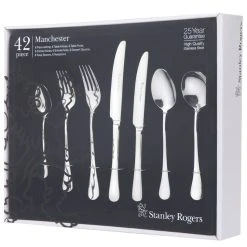 Set contains formal place setting for eight: 8 Dinner Knives, 8 Dinner Forks, 8 Entree Knives, 8 Entree Fork, 8 Dessert Spoons, 8 Soup Spoons, 8 Teaspoons